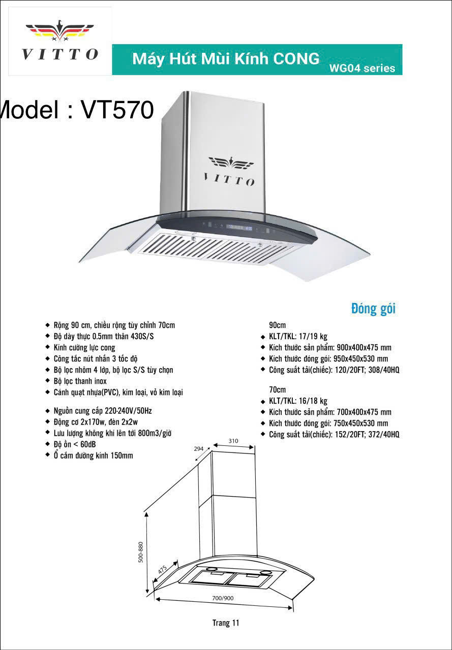 MÁY HÚT MÙI KÍNH CONG CẢM ỨNG GẠT TAY VITTO - MODEL: VT570 Với kích thước 70cm máy có thể kết hợp với rất nhiều kiểu bếp vì hầu hết các bếp đều có kích thước tương xứng. Máy phù hợp với những không gian rộng rãi sẽ tăng thêm vẻ sang trọng cho gian bếp của bạn. Chất liệu của máy được làm bằng chất liệu inox và kính cường lực tăng độ bền cho máy và độ an toàn cho người sử dụng.