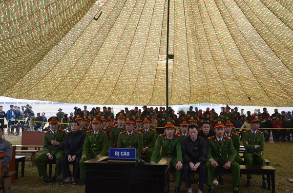 Có 9 bị cáo bị đưa ra xét xử gồm có: Bùi Văn Công, Phạm Văn Nhiệm, Lường Văn Hùng, Lường Văn Lả, Phạm Văn Dũng, Cầm Văn Chương, Vì Văn Toán, Vương Văn Hùng và Bùi Thị Kim Thu (cùng quê ở Điện Biên). Từ khoảng 7h15 sáng, 9 bị cáo trên đã bị áp giải tới Sân vận động tỉnh Điện Biên.