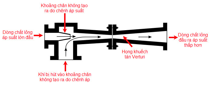 Khi diện tích giảm, áp suất tăng, do vậy khi đi qua khe hẹp, diện tích mặt cắt đường ống giảm làm áp suất tăng do vậy áp suất phía trước khe hẹp lớn hơn rất nhiều so với áp suất sau khe hẹp, theo nguyên lý Venturi nó tạo ra một vùng chân không hút không khí vào. Không khí hút vào hòa cùng dòng chất lỏng tạo ra sự hòa trộn chất lỏng và không khí ở đầu ra.