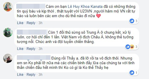 Chia sẻ của trợ lý ngôn ngữ Lê Huy Khoa nhận được sự đồng cảm rất lớn từ bạn bè, người thân và các cổ động viên. Mọi người đều gửi lời chúc mừng tới thành công của U23 Việt Nam và hy vọng thầy trò HLV Park Hang Seo sẽ tiếp tục tạo nên bất ngờ trong trận chung kết.