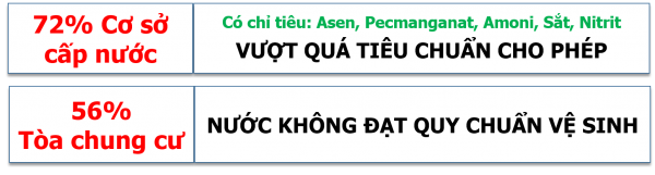 67/120 (chiếm 56%) tòa nhà chung cư có chất lượng nước không đạt quy chuẩn. Cụ thể là: 13 tòa nhà có nguồn nước không đạt chỉ tiêu hóa học; 36 tòa nhà có nguồn nước không đạt chỉ tiêu vi sinh vật; 18 tòa nhà có nguồn nước không đạt cả hai chỉ tiêu trên.